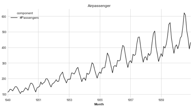 누구나 아는 대표적인 비행기 탑승객 시계열 데이터입니다. 월단 데이터이고 multiplicative 시계열 형태를 띄고 있습니다.