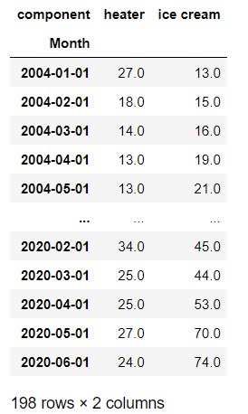 2004년부터 2020년까지 월간 히터 판매량과 아이스크림 판매량 데이터 입니다.