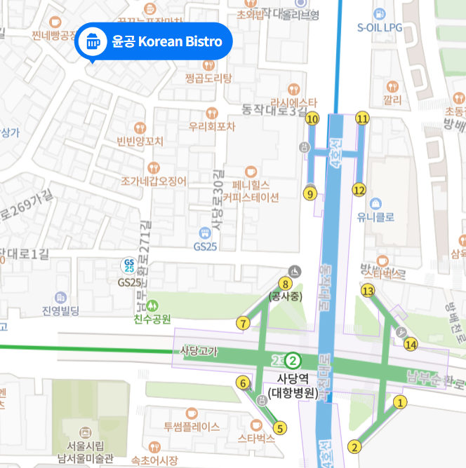 사당역 10번출구 스타벅스 골목으로 들어와서 200m 직진 하면 우측에 윤공!
