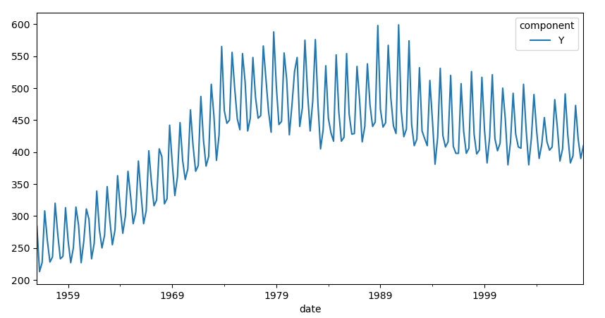 데이터가 장기적으로 증가하거나 감소할 때 추세가 있다고 합니다. 데이터 전체적인 방향성을 이야기한다고 할 수 있습니다. 위의 예시데이터에서 추세를 살펴보면 1959년부터 1975년(1969년~ 1979년 사이) 동안 증가하는 추세를 보이고 그 이후에는 추세가 없다가 감소하는 경향을 보이고 있습니다.