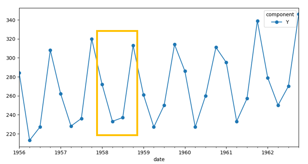 위의 예시데이터의 앞부분만 자세히 확대해보았습니다. (3개월 단위 데이터입니다)