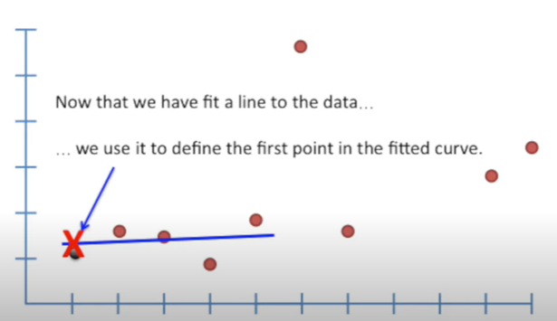 그린 가중평균회귀 직선의 y1 값을 1차적인 추세로 뽑습니다. 이런식으로 추세를 뽑게 되면 데이터 손실이 일어나지 않게 됩니다. 그림의 빨간 X가 가중평균회귀직선으로 뽑은 추세 데이터가 됩니다.