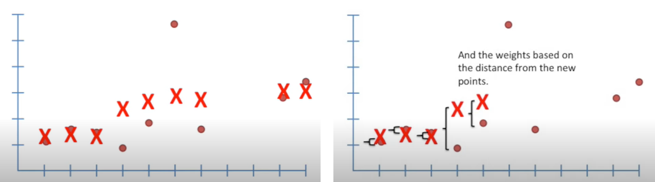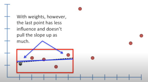 (x1,y1) 에 가까운 데이터에 가중치를 더 부여하여 가중평균 회귀직선을 그립니다.