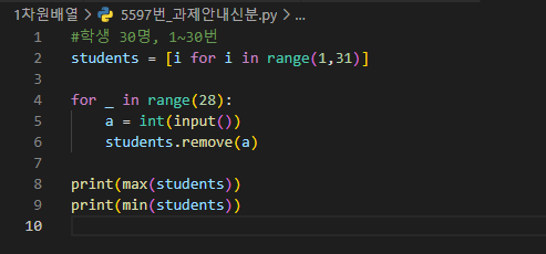 전체 학생 30명 중 28명이 과제를 제출한 상황에서 과제를 제출하지 않은 2명의 번호를 출력하는 문제