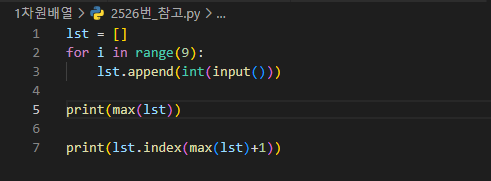 최댓값을 출력하고, 둘째 줄에 최댓값이 몇 번째 수인지를 출력하는 문제