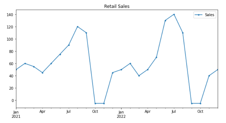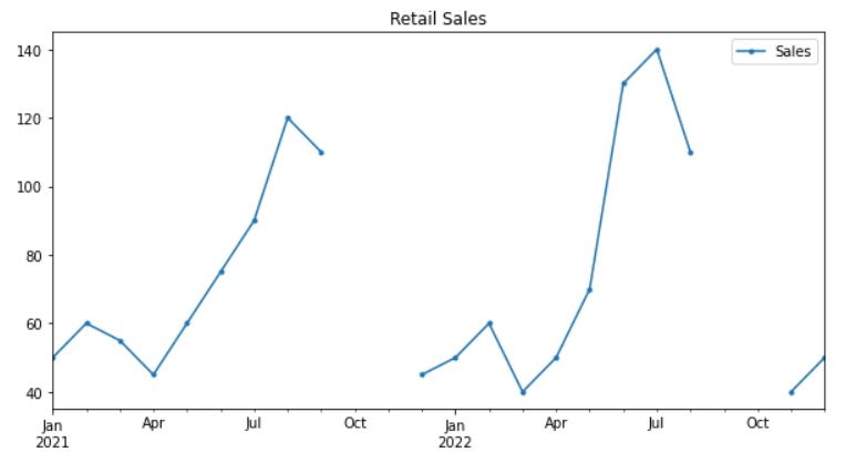 df.plot(figsize=(10,5), title="Retail Sales", marker='.')