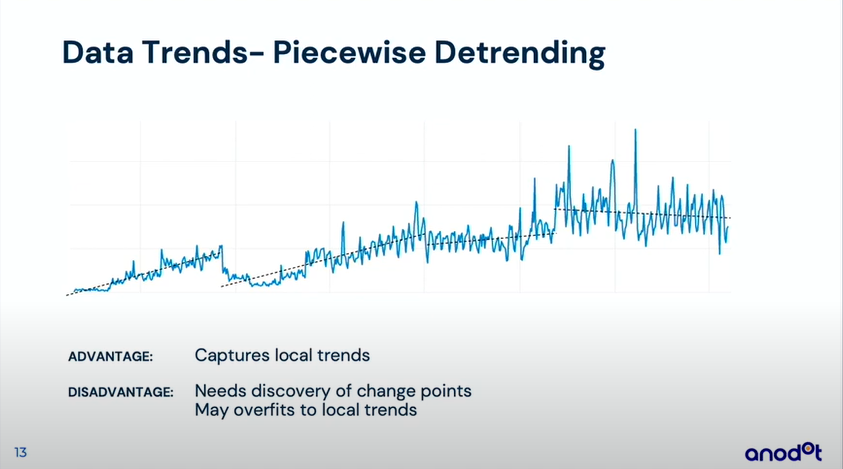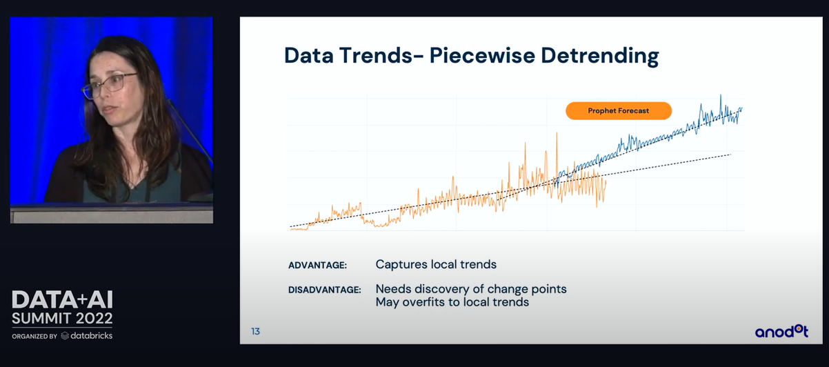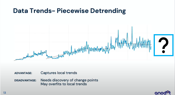 제가 최근에 봤던 영상 "Challenges in Time series forecastng" 이고 이 추세를 예측하는 부분이 어려운 점이라고 강연합니다. 전체적인 추세(global trend) 와 지역적 추세(local trend)가 있는데 local trend로 예측하게 되면 아래 그림과 같이 오버피팅으로 인해 성능이 안좋았다 를 이야기하고 있습니다.