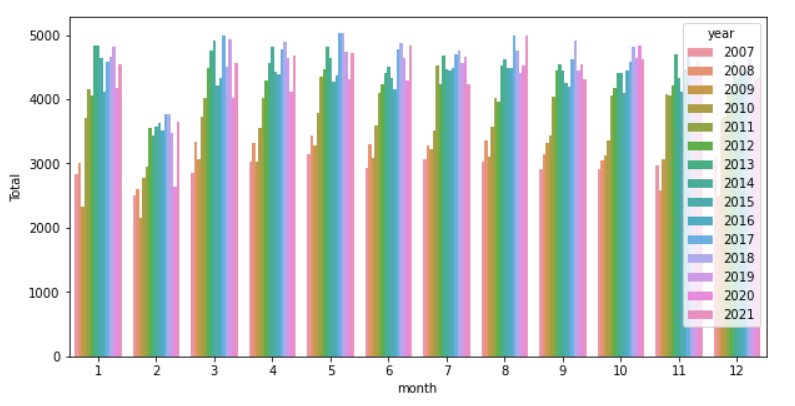 위의 연도별 그래프에 각 연도마다 월별 그래프를 추가하였습니다. seaborn의 경우 hue 라는 파라미터를 사용하여