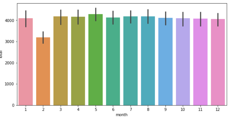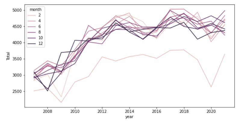 각 월별로 비슷한 추세로 움직이지만 2월달이 특히 작은 값인 것을 알 수 있습니다.