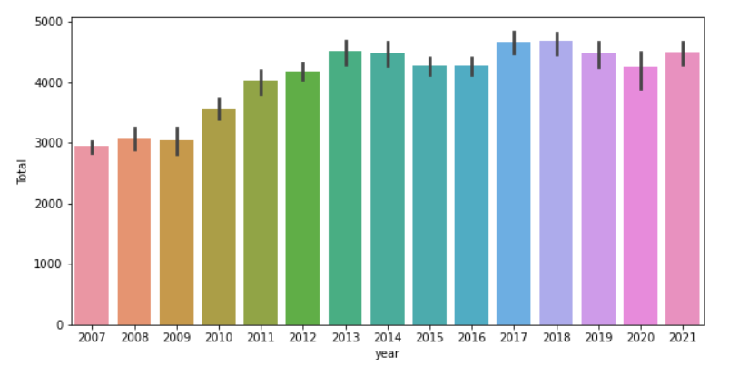 연도별로 데이터를 시각화 함으로서 대략적인 추세를 알 수 있습니다.