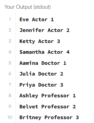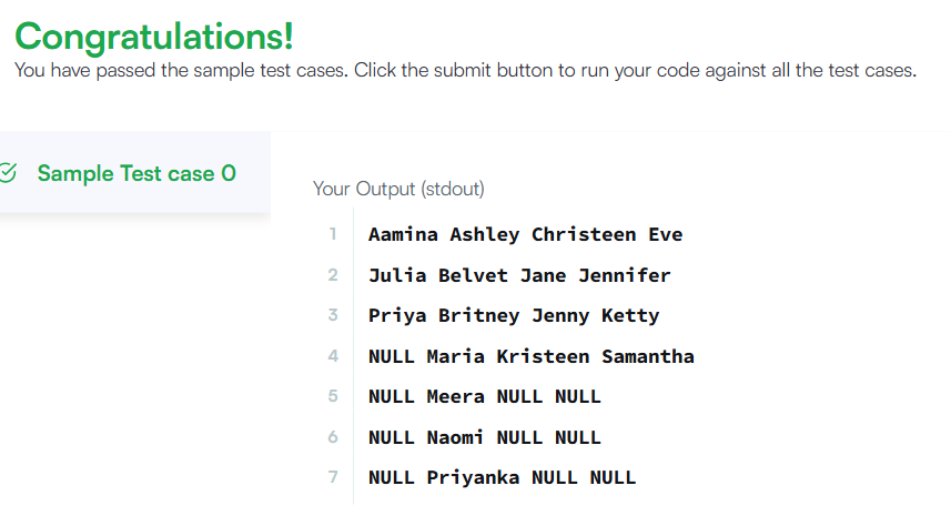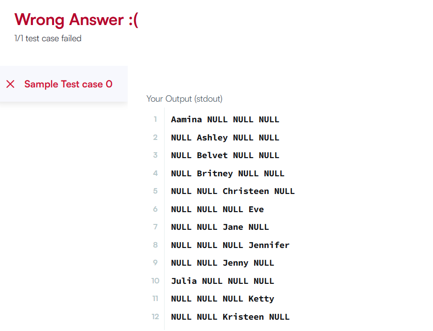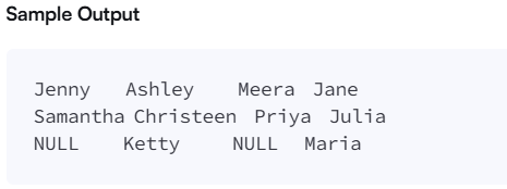 Note: Print NULL when there are no more names corresponding to an occupation.