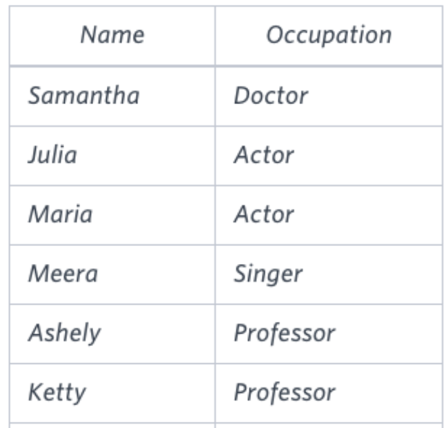 Q. Occupations 테이블에서 Occupation 컬럼을 4개의 컬럼(Doctor, Professor, Singer, Actor) 피봇형식으로 출력하시오. (단, 알파벳 순으로 정렬)