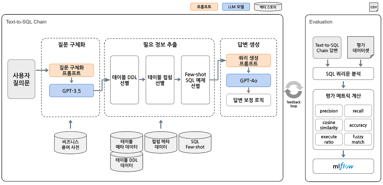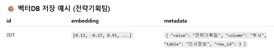 [사용자 자연어 질문] ──▶ [임베딩 벡터화] ──▶ [셀 단위 벡터DB에서 유사값 검색] ──▶ [원래 테이블 구조와 매핑] ──▶ [SQL 생성]