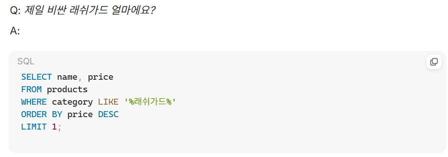 Q. 제일 비싼 래쉬가드 얼마에요? 라는 질문에 대해 sql을 작성하게 되면 아래와 같습니다.