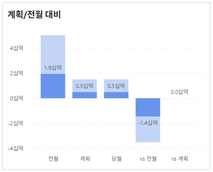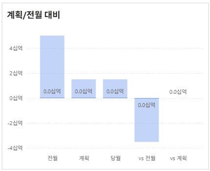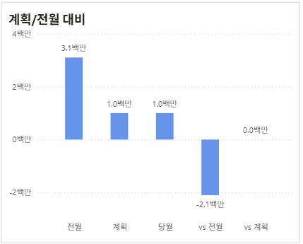 이럴 경우 필터링을 잘 활용하면, 아래와 같이 전체값이 아닌 세부적인 값만 나오게 만들 수 있습니다. 전체 몇십억 중 단 300만원이라는 수치도 계획,전월에 대해 잘 비교될 수 있도록 시각화 할 수 있었습니다. 해당 로직을 밝힐 순 없으나 행,열 필터링 로직을 잘 활용하면 원하는 시각화를 할 수 있다는 점을 알아주시면 좋을 것 같습니다.