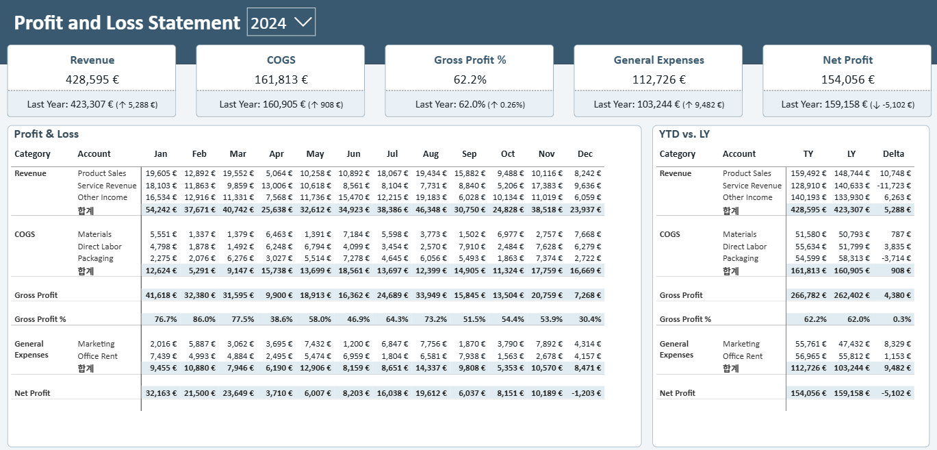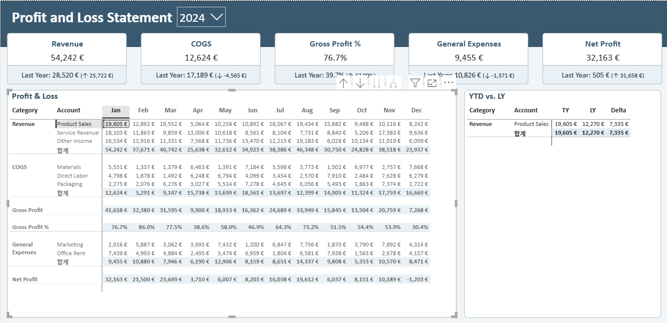 총 3가지의 필터링이 걸리면서 다른 데이터의 객체도 해당하는 데이터만 나타나게 됩니다. 즉, 다른 시각화 객체에서도 Category = 'Revenue', Account = 'Product Sales', Month = 'Jan' 3가지의 필터링이 걸린 결과가 나오게 되는 거죠. 이 원리를 알아야 시각화에서 기능적으로 표현하고 싶은 걸 표현할 수 있습니다.